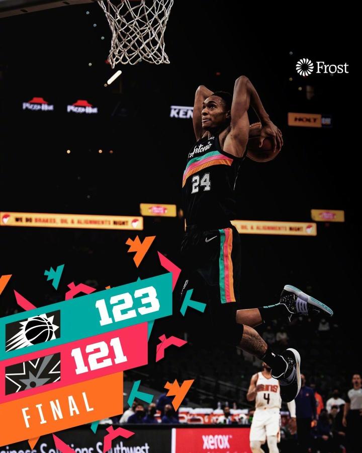 本场比赛太阳主力轮休,摩尔三分准绝杀马刺,太阳三连胜结束常规赛,送马刺四连败。赛前,太阳轮休了大部分主力球员,马刺这边出于练兵需要全主力出战。本役双方打的很有默契,上半场马刺发威61-52领先,下半场太阳吹响反攻号角,摩尔终场前2.2秒射落三分准绝杀,太阳123-121战胜马刺。后面爵士战胜国王,太阳西部第二进入季后赛,马刺排名西部第十,附加赛客场对战灰熊,马刺输掉这场比赛后,战绩落后奇才黄蜂,目前能获得12顺位,但最后结果依旧需要看附加赛战况。数据方面太阳这边摩尔22分,杰文-卡特19分10篮板9助攻3抢断;马刺队这边,德罗赞23分4助攻,珀特尔17分10篮板3封盖。