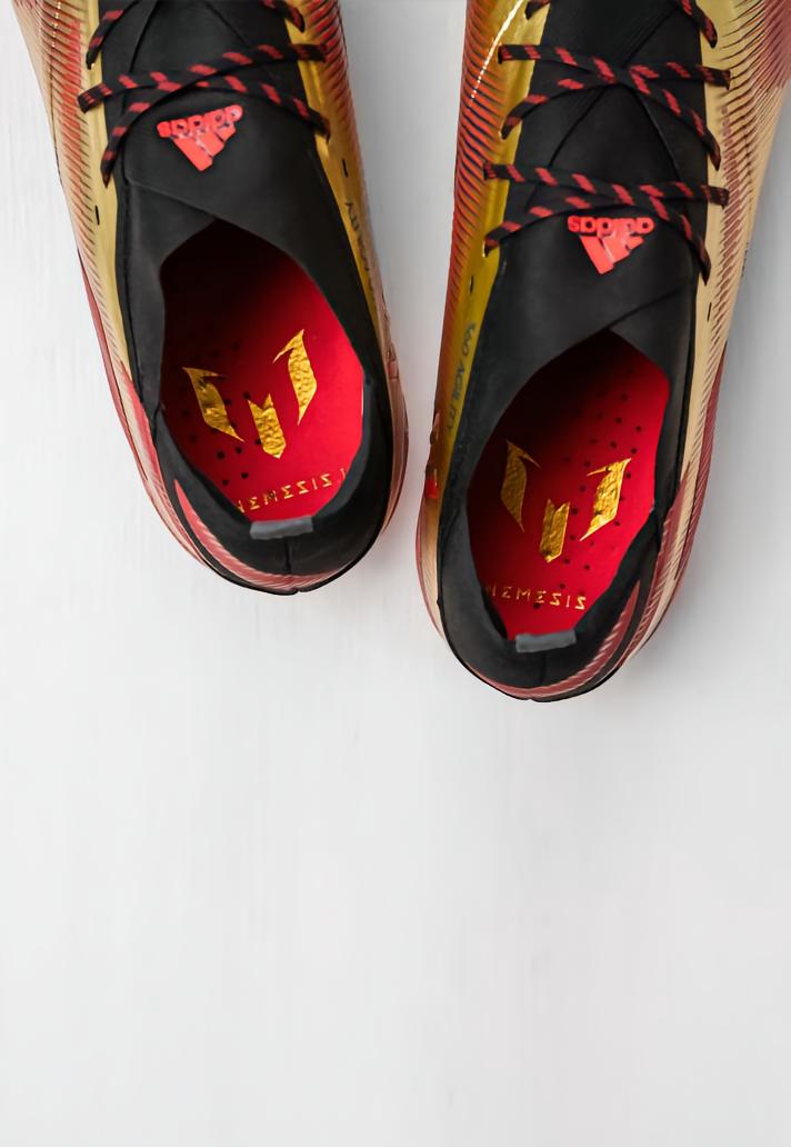 Nemeziz在夏天后就会销声匿迹的谣言愈演愈烈,倘若属实,那么这必定是梅西最后一款专属版本的Nemeziz足球鞋。或许是对先辈的呼应,鞋面大面积采用金色,这与同时亮相的 X 和猎鹰形成了鲜明的对比。除此之外,一些细微的个人化细节装饰和梅西的logo也都添加了这尊贵的金色。
