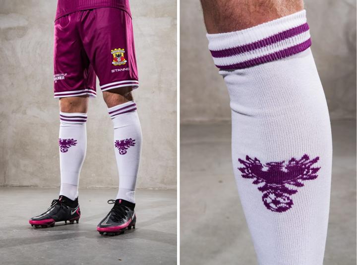 灵感源自上世纪70年代经典球衣的紫色成为前进之鹰新赛季客场球衣的主色,细密的竖条纹暗纹设计让这件致敬经典的球衣更具复古感。白色圆领与袖口上加入紫色条纹进行装饰,紫色球裤与白色球袜一同组成球队崭新的新赛季客场形象,球袜胫骨位置还加入源于俱乐部徽章的雄鹰形象。