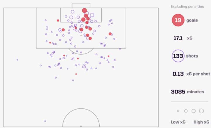 下图为凯恩的射门图例: