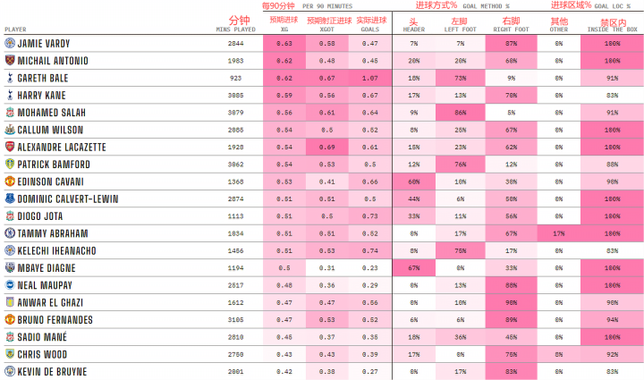 莱斯特城的杰米-瓦尔迪完成了英超联赛中最高的每90分钟的预期进球xG,然而他是本表中实际进球不能匹配预期进球的联赛前10名中的6名球员之一(还有安东尼奥、班福德、勒温、马内和德布劳内,其中班福德和勒温实际与预期非常接近,德布劳内的平均射门距离较远)。