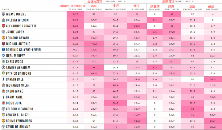 姆巴耶-迪亚涅在这份名单中记录了最高的预期进球xG,他展示了在禁区内进入良好得分位置的能力。自从1月租借加盟西布朗以来,这位塞内加尔前锋超过40%的射门都来自于高清晰度的情况,同时有超过三分之一的射门来自于他处于低压力时。