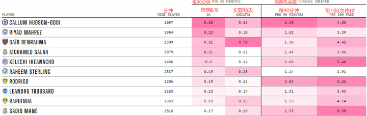 这份名单中一位遗漏的球员是托特纳姆热刺的哈里-凯恩。尽管在2020-21赛季,他的助攻数比其他任何球员都多(14次),但这位前锋每90分钟的预期助攻xA为0.11,在这个指标上,他排在联赛20名之外。(队友良好的把握机会能力使凯恩的助攻数上升到了一个新的高度)