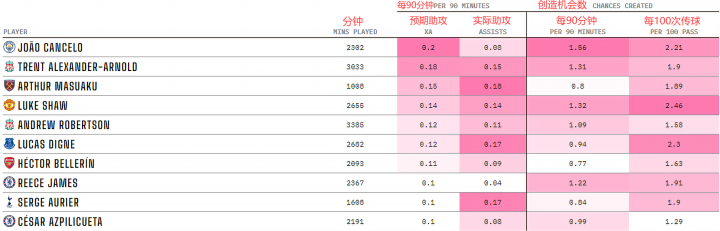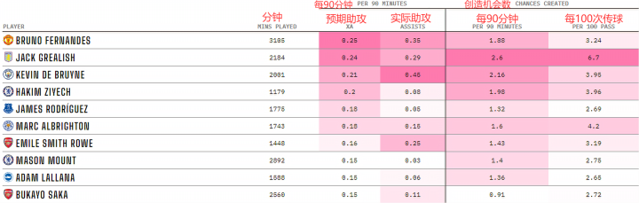 尽管因伤缺席了部分比赛,但杰克-格拉利什对阿斯顿维拉在进攻端的影响是显而易见的。除了每90分钟的预期助攻xA排名联赛第三外,这位25岁的球员在每100次传球中创造的机会的次数在所有列出的球员中排名第一,且几乎可以完爆所有人。
