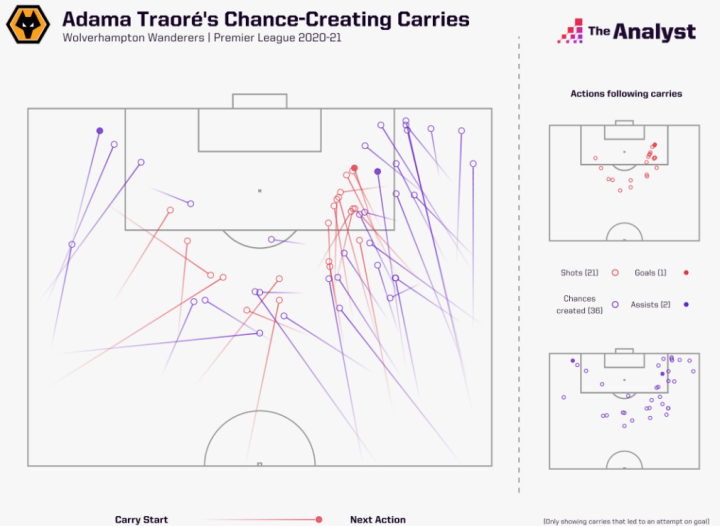 狼队的阿达马-特劳雷和佩德罗-内托凭借带球联合创造了106次的机会,但是他们自己或者他们的队友仅仅把握住了其中的6次。此外,特劳雷还完成了本赛季最高的球员每次带球垂直移动的平均距离,达到了恐怖的10.11米。