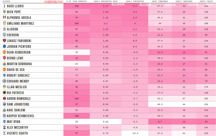 Goals Prevented((阻止进球)=xGOT Conceded(预期射正丢球)- Goals Conceded(实际丢球)