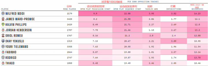 在中场位置出现了一些熟悉的名字,但值得注意的是,威尔弗雷德-恩迪迪在莱斯特城的中场起到了重大的影响。这位24岁的球员要比名单上的任何其他一位中场球员发起了更多的序列(或者说由守转攻,再深入点可能会涉及到第二次的由守转攻),同时在抢断、拦截和夺得二分之一球的球权等指标中,恩迪迪名列前茅的数据也向我们展示了他防守的坚韧。