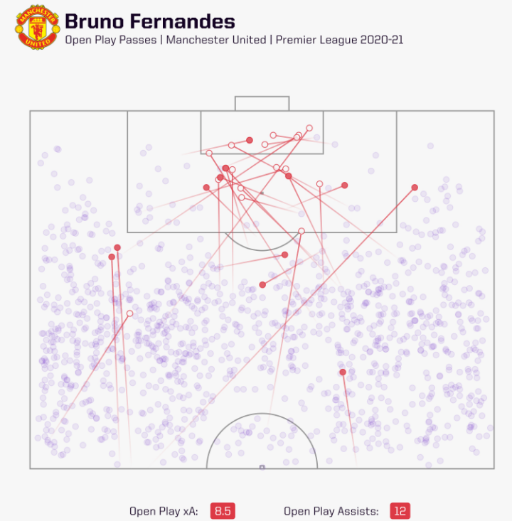 在英超第一个完整赛季中,布鲁诺-费尔南德斯记录了在所有球员中和奥多伊并列最高的预期助攻xA(0.25),这也为曼联贡献了每90分钟0.35次的助攻。