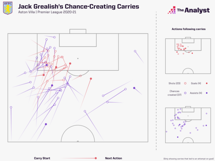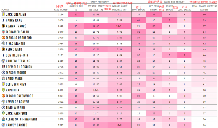 阿斯顿维拉的杰克-格拉利什连续第二个赛季位列榜首,而仅次于之后的是他英格兰队的队友哈里-凯恩。尽管每90分钟的带球次数不到格拉利什的一半,但这位热刺球员在带球后总共完成了41次射门,比联赛任何一位球员都多,并且在至少5米的带球后,凯恩贡献了他赛季总助攻数一半的助攻。