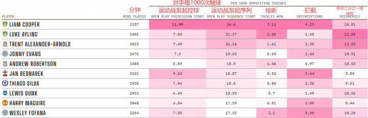 不出所料,后卫和防守型中场球员在这份名单中占主导地位,这让我们更好地了解了哪些球员在防守端会参与的更多。