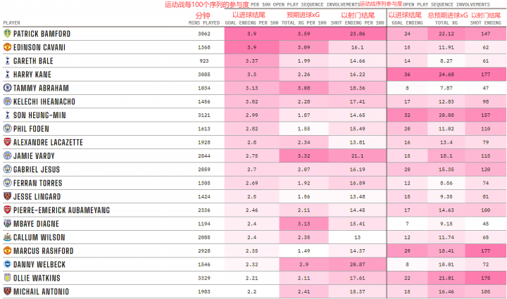 下表按照参与进球数最多的球员来排名(每100次运动战序列的参与次数)。展现了球员在进攻端的参与度。