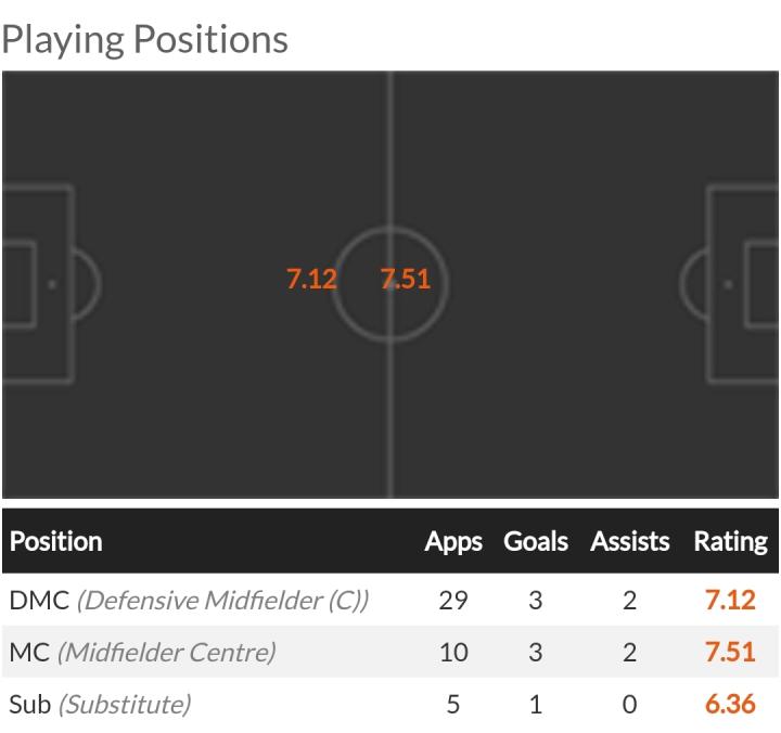 洛卡特利可以胜任中场任何位置,但在萨索洛更多的是出任后腰位置,根据Whoscored网站给出的数据,洛卡特利在后腰位置评分7.12分,中前卫评分7.51分。