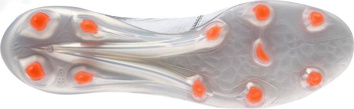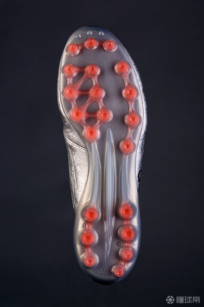 鞋底采用printframe科技,其实就是把原本用来加强中底的TPU与后跟合并了。鞋底材料为尼龙,半透明,韧性强,软硬适当。FG鞋钉设计回归传统,既没有“龙骨”也没有AG/FG混钉,与F50四代类似。