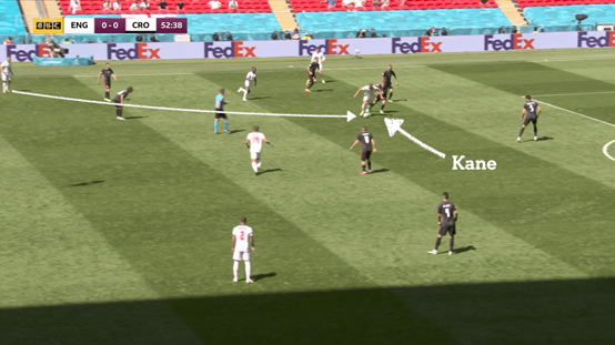 凯恩在压力下接球,带球转身,可以在克罗地亚半场继续推进。