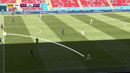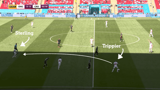 特里皮尔的右脚长传打克罗地亚防线身后也很有用,下面场景是第8分钟时他首次寻求打克罗地亚防线身后。