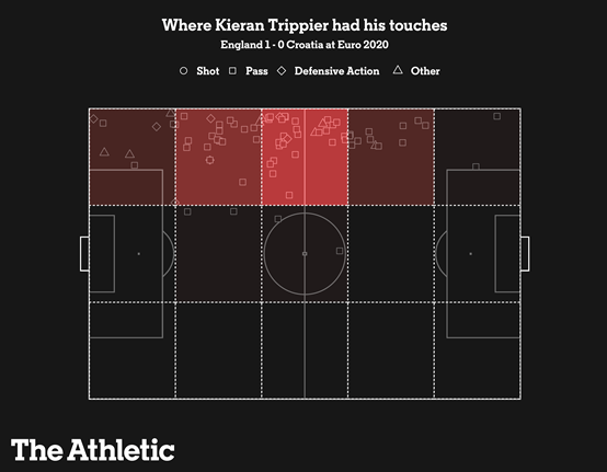 与斯皮纳佐拉相比,特里皮尔的角色要保守得多。他攻入前场的次数要比意大利人要少得多,而且他在禁区附近的触球都是来自于他的边线球,而不是来自于他在场上的支援跑动,特里皮尔总共84次触球,对英格兰在当天的比赛中执行他们的计划至关重要。