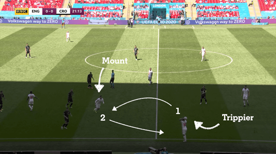 这是一个标准的界外球战术,特里皮尔把球掷给芒特(1),芒特的第一次触球就把球直接传了回来(2)。由于特里皮尔用右脚控球,他有一个开放的身体位置,使他在前场有很多传球角度。