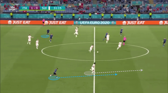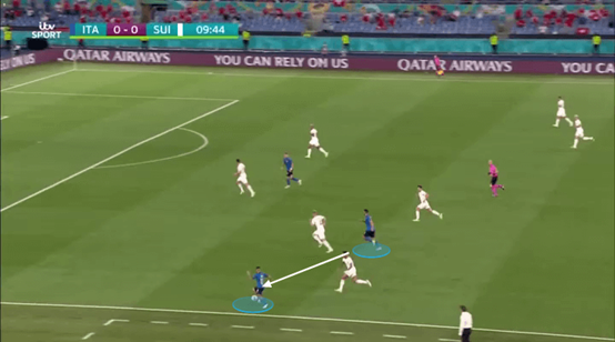 不过,斯皮纳佐拉的右脚向内移动的能力意味着他经常可以做出令人意想不到的跑动。在下面场景,当他把球传给因西涅时,他进行了一次内切。