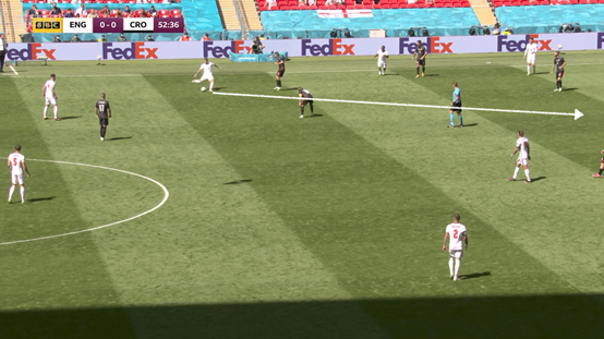 下半场也有类似的例子,特里皮尔在克罗地亚半场的位置。他的身体位置是指向内场的,特里皮尔得球,因为他的右脚,他可以创造一个传球通道直接给哈里凯恩。