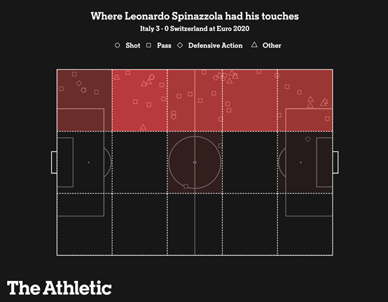 下图显示了斯皮纳佐拉在3-0击败瑞士的比赛中的所有触球。请注意他在进攻三区的触球次数,以及他是如何在因西涅的内侧或通过靠近边线来寻求触球的。
