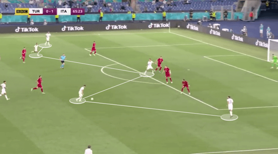 迄今为止在意大利的两场比赛中,后者的移动特别值得注意。下面是他们对土耳其的第二个进球前的瞬间,斯皮纳佐拉在左翼的位置很高。最终,贝拉尔迪的传球在远门柱找到了他,他的射门让因莫比莱有机会将球打进。
