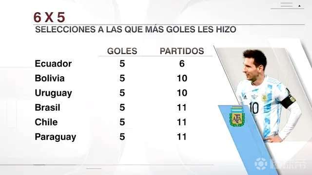 梅西6次对阵厄瓜多尔打入5球|阿根廷将在美洲杯1...Football-News @懂球帝2021-06-29 13:12梅西6次对阵厄瓜多尔打入5球| 阿根廷将在美洲杯1/4决赛中对阵B组第四名厄瓜多尔。 根据SportsCenter的统计,梅西6次在阿根廷对阵厄瓜多尔的比赛中出场,攻入5粒进球。 梅西对阵部分南美球队进球数据: 厄瓜多尔——6场5球 玻利维亚——10场5球 乌拉圭——10场5球 巴西——11场5球 智利——11场5球 巴拉圭——11场5球展开更多