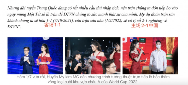 而对于越南队参加世界杯决赛圈的前景,尤其是对阵中国队的两场比赛,HuyenMy充满乐观和梦想,她做了一个大胆的预测: