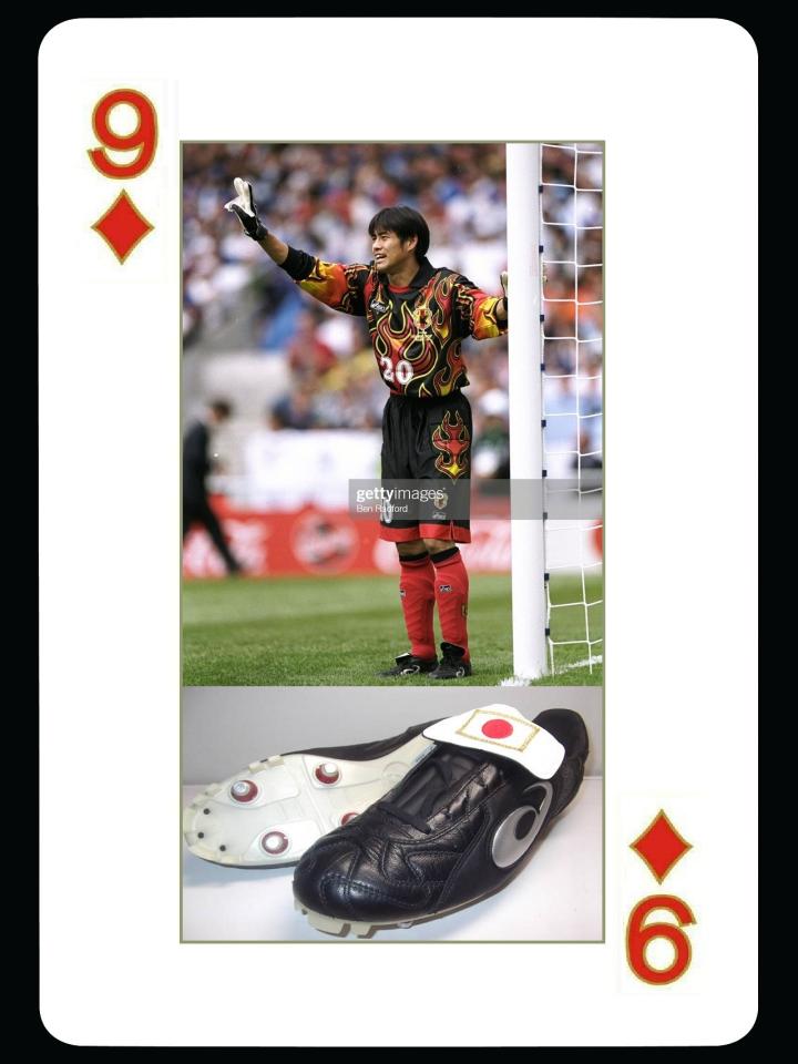 但是在竞争激励的足球领域,他们的营销总是充满了投机倒把的色彩。今天我们就来介绍一下asics在日本本土的一些代言球星,为什么说asics品牌喜欢投机倒把,1996年奥运会上,日本国家队爆冷1比0击败巴西,当时巴西队拥有罗纳尔多,贝贝托,卡洛斯等众多名将。而日本队表现最出色的门将川口能活,当时他使用的德国品牌uhlsport的手套和足球鞋。奥运会结束后,asics品牌马上和人气飙升的川口能活签约,还生产了asics的守门员手套给川口能活使用。1998年世界杯,asics更是孤注一掷赞助了日本国家队,川口能活的adidas绿色火焰战袍也被移到了asics的球衣上。亚瑟斯还为川口能活定制了一双janus f98的川口能活专用门将球鞋,这款鞋的鞋身logo是字母a,鞋舌是日本国旗刺绣,鞋底模仿了uhlsport的大板牙鞋底,此后川口能活一直为asics代言到退役。