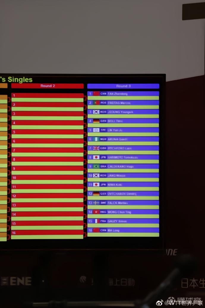 男单项目,樊振东与张本智和同处上半区,马龙与奥恰洛夫等强敌处在下半区。