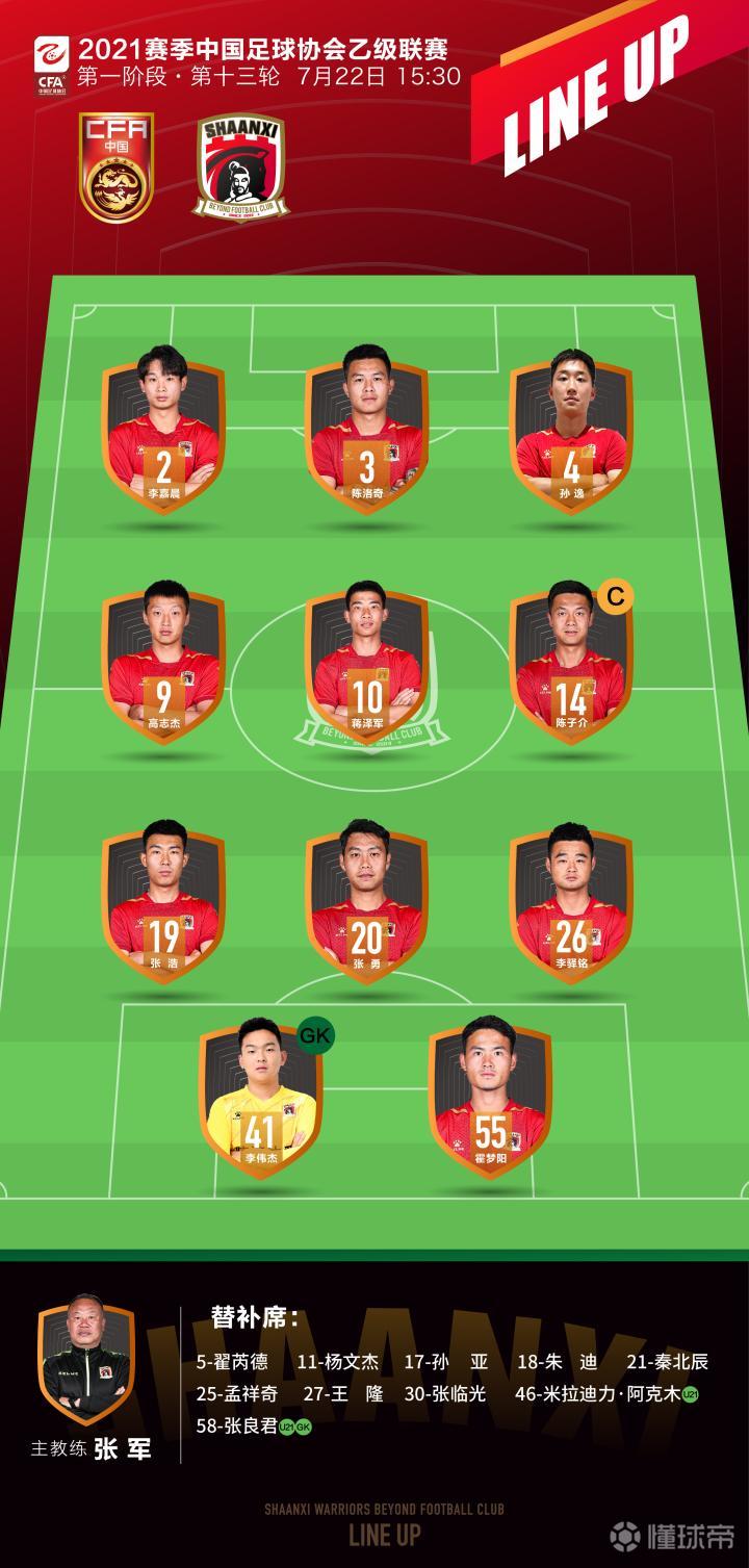 [首发名单]2021赛季中乙联赛第一阶段第十三轮,U20国家队 VS 陕西俑士超越-球员首发及替补名单 『首发』 2-李嘉晨,3-陈洛奇,4-孙逸,9-高志杰,10-蒋泽军,14-陈子介(C),19-张浩,20-张勇,26-李驿铭,41-李伟杰(GK/U21),55-霍梦阳(U21) 『替补』5-翟芮德,11-杨文杰,17-孙亚,18-朱迪,21-秦北辰,25-孟祥奇,27-王隆,30-张临光,46-米拉迪力·阿克木(U21),58-张良君(U21/GK)
