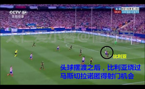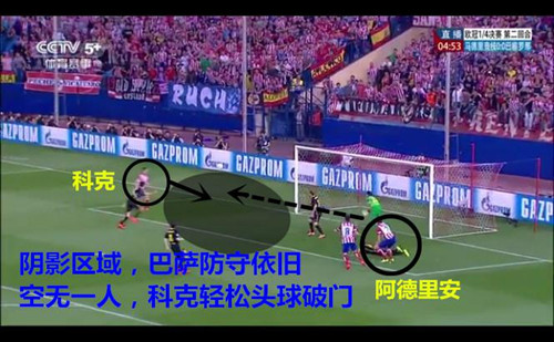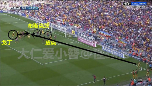巴萨两名身材高大的球员皮克与布斯克茨在前点站区域保护,而将对方身材高大的争顶球员留给了小个子,最终就因为盯人不紧,戈丁头球为马竞带走了冠军。