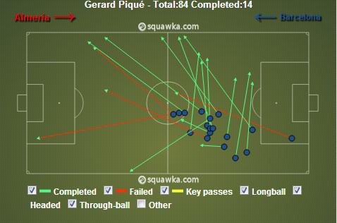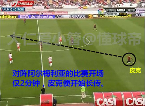 皮克在对阵阿尔梅里亚的比赛中向前的长传成功率不足5成。