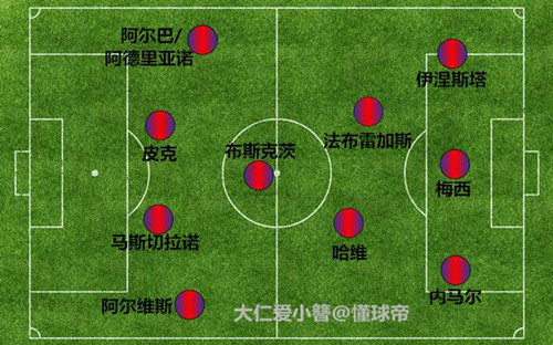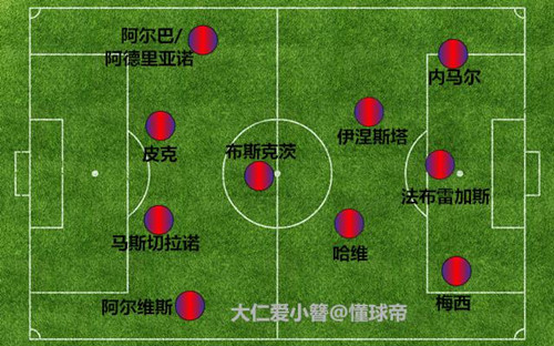 4中场同时登场时巴萨的两种阵型,一是小法踢虚拟中锋,梅西和内马尔分居两侧,二是伊涅斯塔踢左路,内马尔改踢右边锋