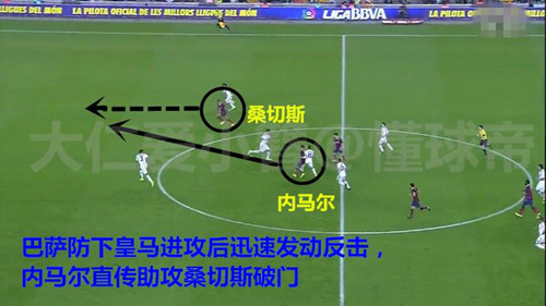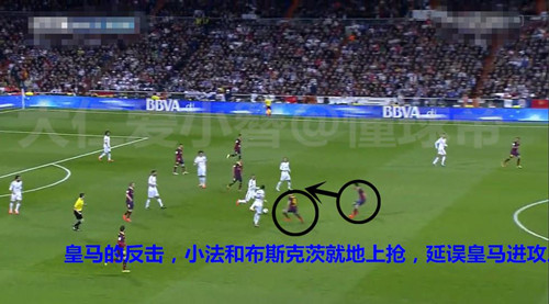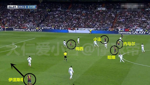 哈维、小法在右边和梅西做配合的时候,皇马几乎所有防守球员的目光都被他们吸引,忽略了伊涅斯塔的前插。