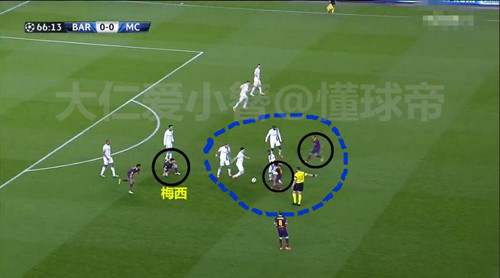 巴萨与曼城次回合,如图所示,虚线范围内,曼城刚刚完成对梅西的夹防并断球,球员都没有完全散开,巴萨便有两名中场迅速靠拢,而正是断下皮球的10秒钟后,梅西接小法传球首开纪录