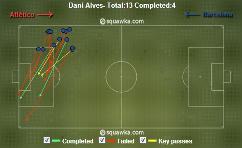 作为球队的右后卫,阿尔维斯一人就13次尝试传中,但失败了9次。