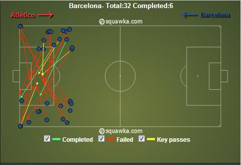 对阵马竞的比赛,包括角球在内,巴萨一共32次选择传中,仅有6次成功。
