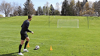 所以我们要调整身体位置,这样我们就可以把球踢得很好,而且很低,守门员很难救球,所以我们再次在20码左右设置了一个门,这次靠右一些,我们要把球推到前面,打开身体,推球射入角落,右脚重复十次,左脚重复十次