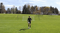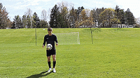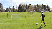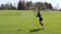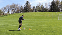 这次训练我们把起点设置到25码处,我们要做的就是把球扔到空间,让它反弹,然后我们脚内侧或鞋带位置向上触球,让球最后落入网中,用右脚做十次,用左脚做十次。