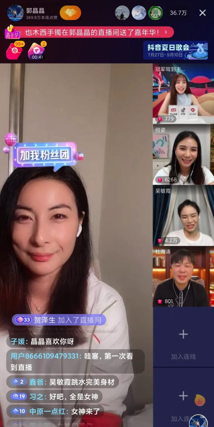 而跳水女皇郭晶晶的首次抖音全网直播,累计观看人次超过2000万,最高同时用户在线人数超71万,一度飙升到当晚的直播榜第一,截至目前其抖音粉丝数约450万。张怡宁抖音首播看播人次超过1143万,最高同时用户在线人数超48万,抖音账号入驻涨粉427万。