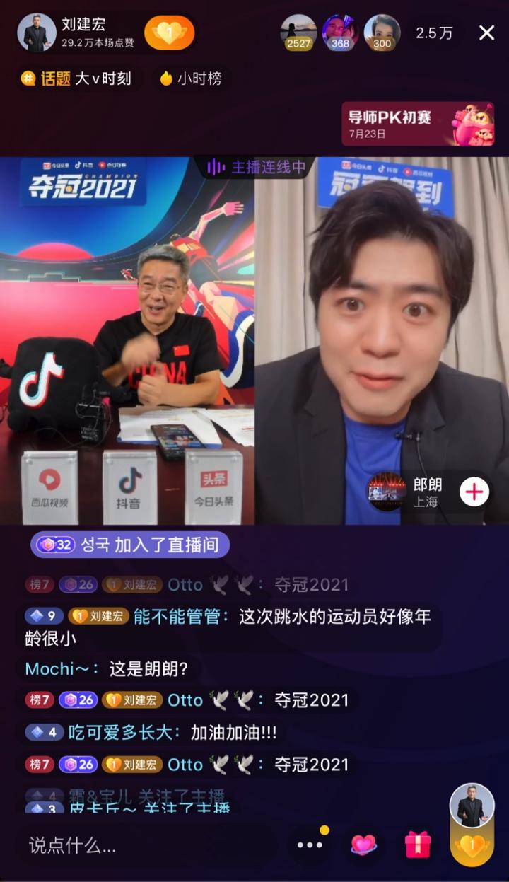 东京奥运开幕之际,抖音携手著名主持人刘建宏同步直播,该场直播以#最特殊的一届奥运会#为核心主题,为用户带来一线的运动员信息。此次直播,抖音特别邀请了许海峰、罗雪娟、曾光、郎朗、王立彬、王濛等各行各业的大咖,通过不一样的互动连线解说,帮助大家快速了解开幕式的现场情况和背后的故事,并针对时下最关心的防疫情况,直播连线防疫专家曾光,聊聊一波三折的筹备与防疫之路。