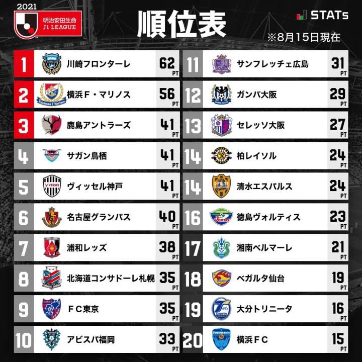 北京时间8月15日,2021赛季J1联赛第24轮的大部分比赛结束。十人柏太阳神0-0逼平川崎前锋;横滨水手5-1大胜大分三神,距离榜首的川崎还差6分,前田大然戴帽;鹿岛鹿角3-0完胜德岛漩涡,升至积分榜第三;浦和红钻2-1力克鸟栖砂岩,江坂任点球绝杀。