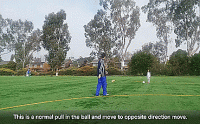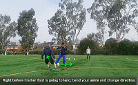 这时,全场的防守队员都会对我们的身体姿势进行预判,但是,当我们触球时,我们转动脚踝将球打向另一个方向。