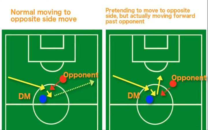 由于位置的原因,防守型中场要经常尝试一些假动作。这个位置即需要具备良好的控球能力,还需要能通过转移换边控制节奏。也正是因为这些原因,防守型中场不能关注那些过分花哨的假动作,但是,可以关注那些看起来不怎么酷但是很有效率的假动作和传球技巧。