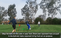 这时我们用脚底把球停住,让对手看到我们即将的拉球动作,防守队员会认为他的预判是对的,会提前到预定方向准备伸脚拦截。