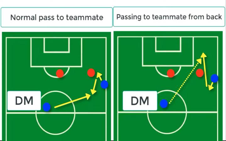 整个动作是这样的,我们首先要不断观察对手身后的空间确保我们可以将球传进对手身后,然后,我们假装一个力度很大的传球,但实际上我们用脚内侧快速送出一个地面直塞,传给前插的队友。