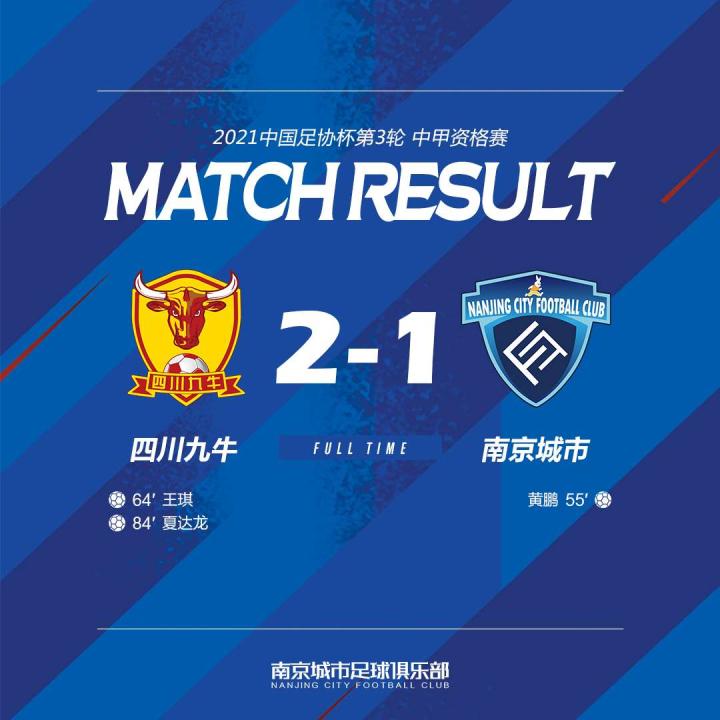 【比赛战报】在今晚刚结束的2021中国足协杯第三轮中甲资格赛上,南京城市一球惜败四川九牛,无缘足协杯正赛。这是两队本月内的第三次交锋,本场比赛,双方都进行了阵容的轮换,南京城市安排了多名年轻小将登场作战。第27分钟,南京城市前场打出短传配合,孙恩明外围施射偏出。第30分钟,南京城市发动快速反击,前锋李锐禁区内被对方门将放倒,裁判果断吹罚点球,李锐亲自主罚遗憾未能命中,南京城市错失改写比分良机,0-0的比分被保持到了中场。 下半场第55分钟,黄鹏右路带球至禁区外起脚吊射,皮球划出一道美丽的弧线直接飞入网窝,对方门将鞭长莫及,只能望球兴叹。南京城市率先打破僵局,四川九牛0-1落后。第64分钟,四川九牛球员禁区内小角度劲射,皮球弹地后破门,比分被扳成1-1。第84分钟,四川九牛依靠高中峰头球再得一分,将比分反超。最终,四川九牛2-1获胜,南京城市足协杯遗憾止步。