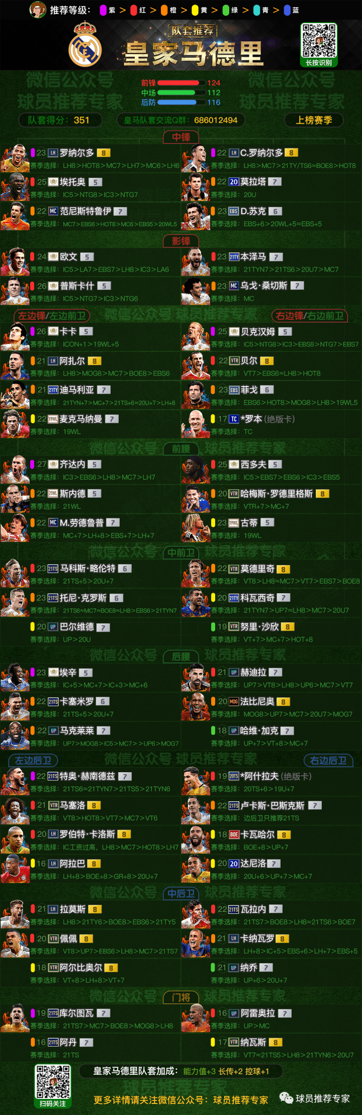 我们可以设定一套规则来反应队套强度。设定紫色12分,红色10分,橙色8.5分(最终结果四舍五入),黄色7分,绿色6分,青色3分,蓝色1分,统计36人大名单的球员的得分(前锋方面:中锋+影锋6名,边锋6名;中场方面:前腰、中场、后腰各4名;后防方面:中卫6名,边后卫4名,门将2名)。根据规则得出皇马套的36人总得分是:351。“银河战舰”皇家马德里真心有点爆强,这分数甚至出乎了我的意料!为什么要在位置推荐榜做完以后再做队套推荐,就是因为这样得出的队套分数会更加客观和准确,每个球员的推荐等级也更加准确,更加有说服力,因为这些球员的推荐等级都是根据全部球员各位置的总榜得来的。就像之前巴黎套推荐里门将多纳鲁马保守的给了红级,但是门将总榜排完以后,很明显多纳鲁马是紫级的选手,所以总榜排完再来推队套是会比较准确的。专家这方面的用心绝对是良苦的,希望兄弟萌可以体会到!