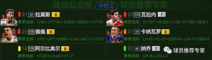 21TS瓦拉内一般来说强化到7卡就非常不错了。没能更进一步也只是因为强化等级问题。瓦拉内的回追是非常恐怖的,有时候就算是一些你觉得不可能的球也给你追回来。对抗方面看起来好像一般,但实际上并不差。81KG的体重加普通体型足以应付绝大多数的身体对抗。更难能可贵的是瓦拉内转身很快,回追这方面几乎是无解的。虽然说现在直塞很流行,但是遇到瓦拉内打直塞是会吃瘪的。赛季选择方面21TS、20TS肯定是最好的,接着BOE和LH也是不错的选择。