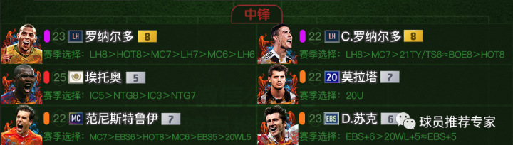 C罗最强的21TY和21TS基本上强化到6卡已经是大部分人的极限了,而目前比较容易搞到的金卡当中LH赛季算是最好的,但是LH赛季又不是双5,稍稍减分,但是也绝对不弱,紫级推荐还是没问题的,因为4逆足完全够用的,只不过比起双5稍微显得有些美中不足。赛季选择方面LH8卡会稍稍好于MC+7和21TY/TS+6,EBS罗是比较尴尬的,185,80的模型本来应该是去打边锋的,但是打边锋能力值又掉太多,打中锋应该给187,83的模型啊,搞不懂策划为什么出了这样一个不伦不类的C罗。赛季选择优先级:LH8>MC7>21TY/TS6≈BOE8>HOT8>20U7>LH7>EBS6>BOE7。
